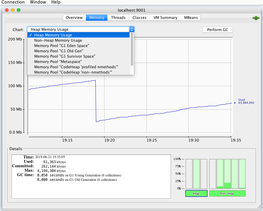 在实际工作中,我们需要通过观察这些指标来诊断系统遇到的性能问题,找到性能瓶颈。如果我们监控到CPU上升,这时我们可以看看吞吐量是不是也上升了,如果是那说明正常;如果不是的话,可以看看GC的活动,如果GC活动频繁,并且内存居高不下,基本可以断定是内存泄漏。