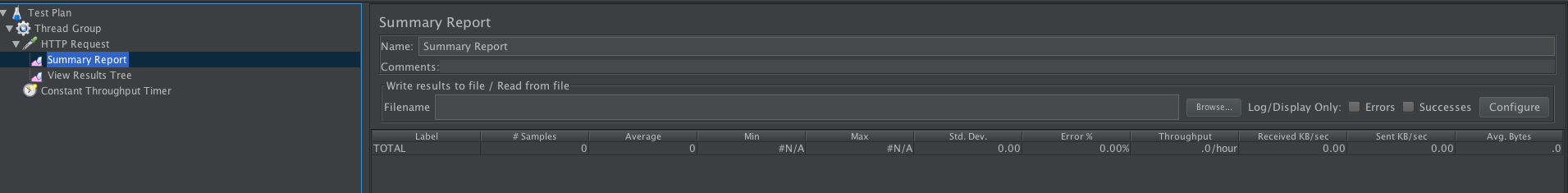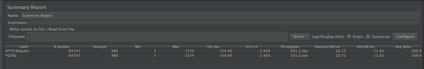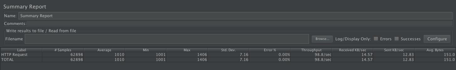 我们会在每个请求的处理过程中休眠1秒,适当地模拟Web应用的I/O等待时间。JMeter客户端的线程数为100,压测持续10分钟。在JMeter中创建一个Summary Report,在这个页面上,可以看到各种统计指标。