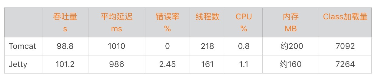 说了一堆理论,你可能觉得还是有点抽象,接下来我们通过一个实例,来压测一下Tomcat和Jetty,看看在同等流量压力下,Tomcat和Jetty分别表现如何。需要说明的是,通常我们从吞吐量、延迟和错误率这三个方面来比较结果。