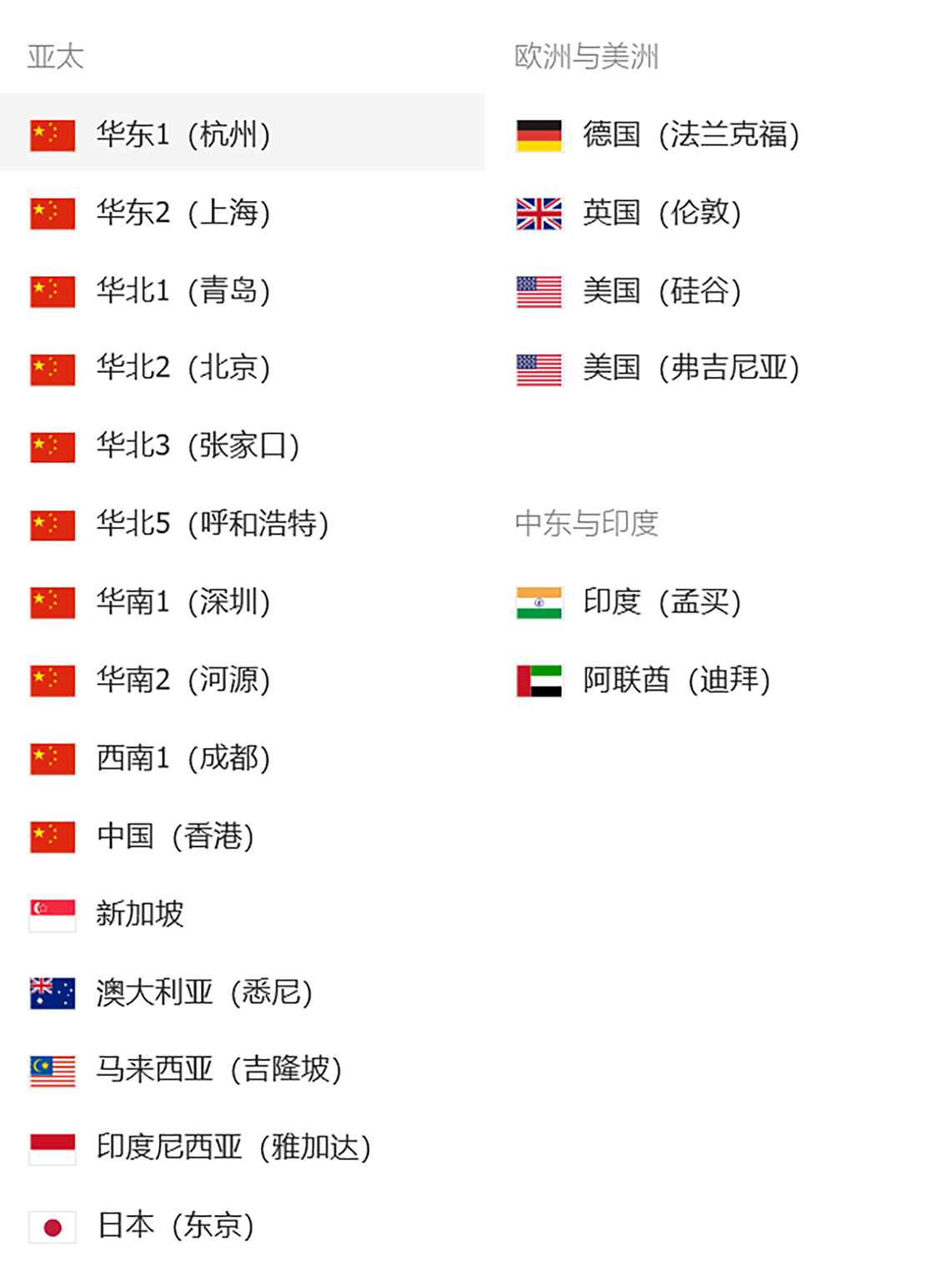 与此同时,每个区域还会有个字母数字构成的区域代号(Region ID或Region Code)。比方说,阿里云华北1区代号为cn-qingdao,AWS美国西部1区的代号为us-west-1等。这些代号方便我们在程序或脚本中对区域进行唯一指定,有时也会出现在门户控制台URL中。