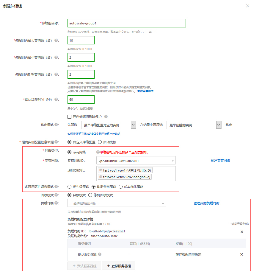 然后,我们就可以创建弹性伸缩实例了。我们来建立一个最小数量为2,最大数量为10的伸缩组。在这个过程中,你尤其需要注意,要选取上一讲中建立的VPC作为目标网络,同时选择两个分属不同可用区的交换机,并设置为均匀分布策略。如下图所示: