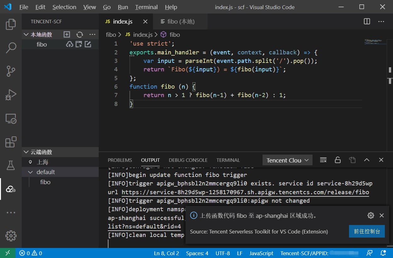 举个例子来说,对于腾讯云的云函数,你可以配合使用Visual Studio Code和腾讯云Serverless插件,来实现在本地编写、运行云函数,还可以一键和云端进行同步。如下图所示:
