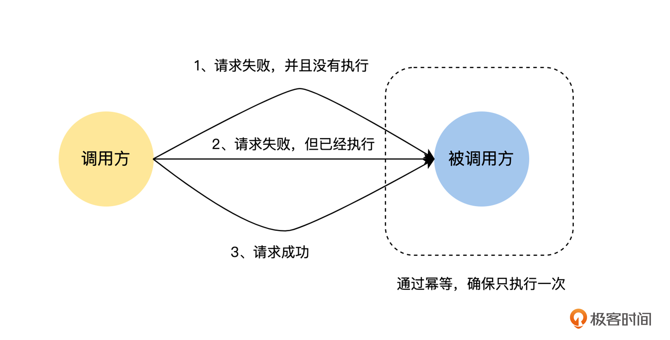 通过上文提到的两个原因,我们可以知道,当请求方收到“请求超时”的时候,我们无法判断远端服务是否处理过这个请求。这个时候就出现了本课开头的问题:如果我们认为这是一个临时的故障,对请求进行重试,那么可能会出现多次执行的情况,即 At-least-once,如果不进行重试,就可能会出现一次都没有执行的情况,即 At-most-once。