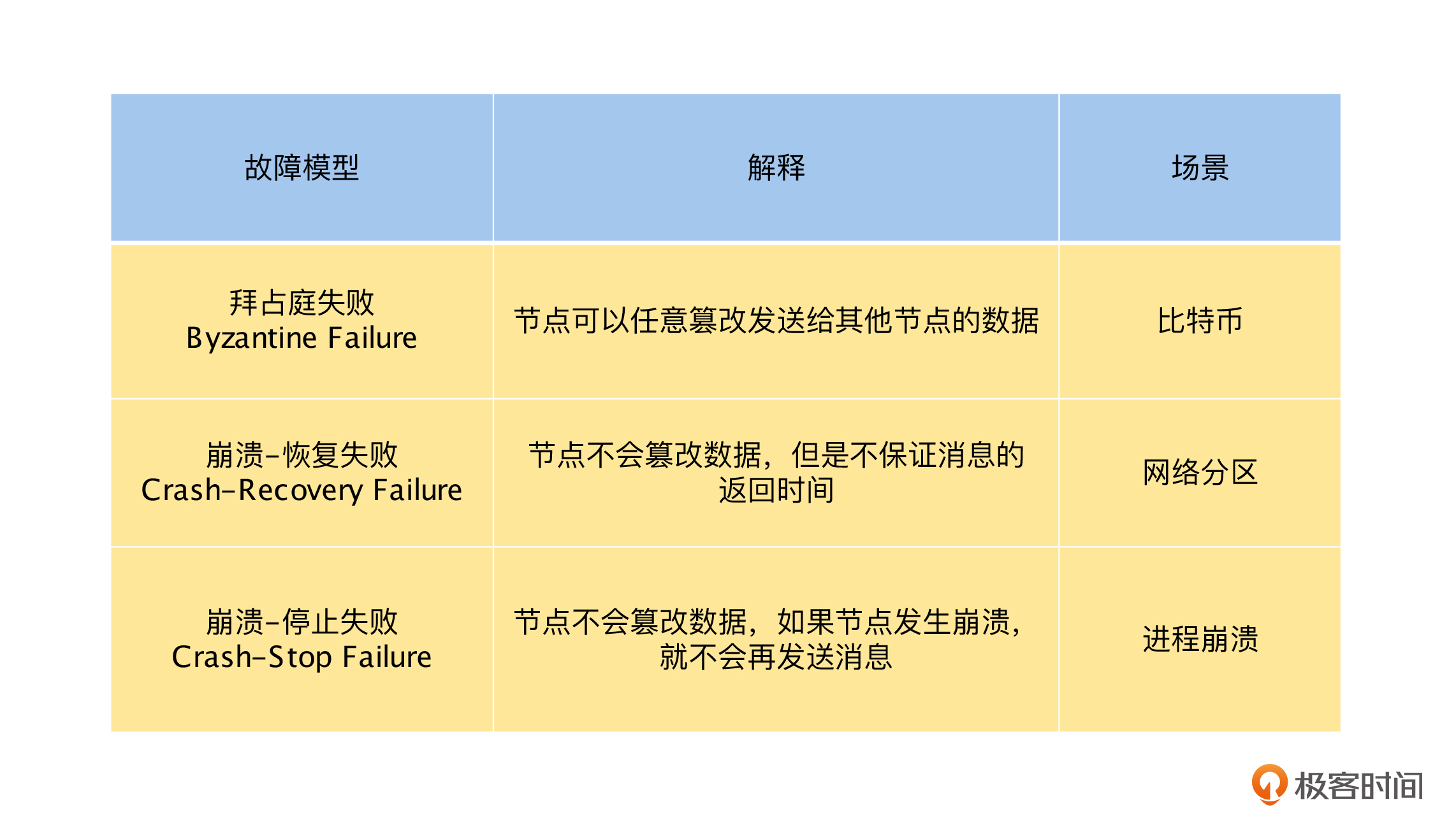 但是,在实际的分布式场景中,由于网络或者计算太慢而故障的节点,待恢复后,很久之前响应的消息是会正常出现的。所以,如果共识算法只能处理“崩溃-停止失败”(Crash-Stop Failure)模型,就不能适应我们实际的网络环境了。接下来,我们总结一下课程中提到的三种故障模型,如下表所示。