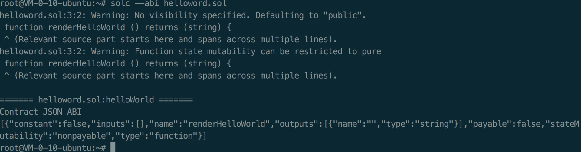编译器警告我们暂时不必理会,接下来我们还需要生成ABI部署参数,使用命令 solc –abi helloword.sol。