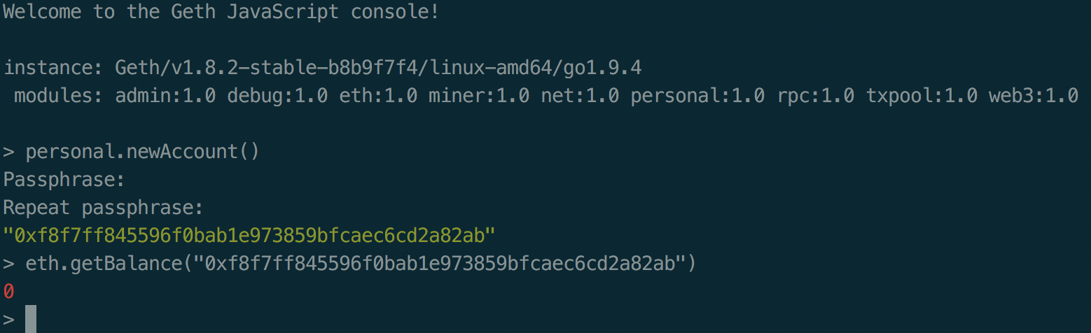 我们创建了一个新账户,这个账户就是EOA账户,并通过eth.getBalance获取了当前地址的余额,显示为0。