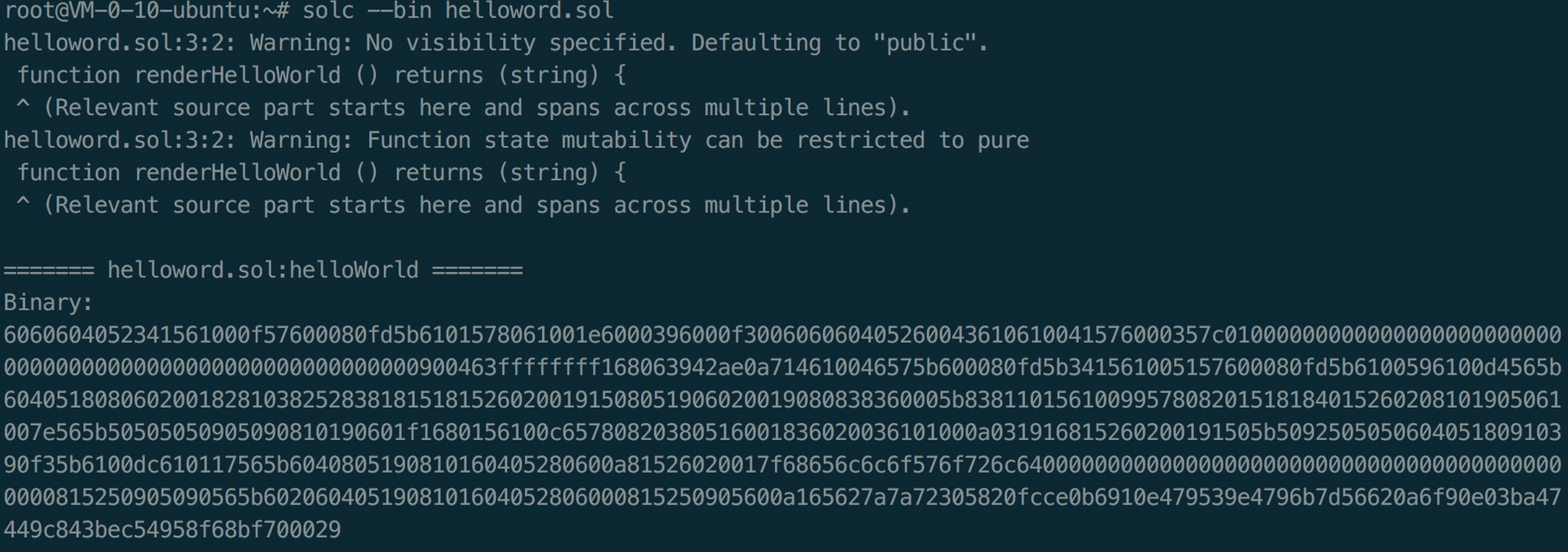执行 solc –bin helloword.sol 获得EVM二进制码。