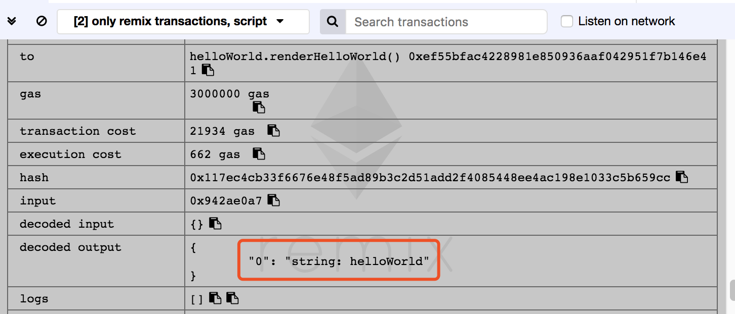 由于我本地挖矿出块异常缓慢,所以我尝试了Remix IDE,运行后我们可以得到如下结果。