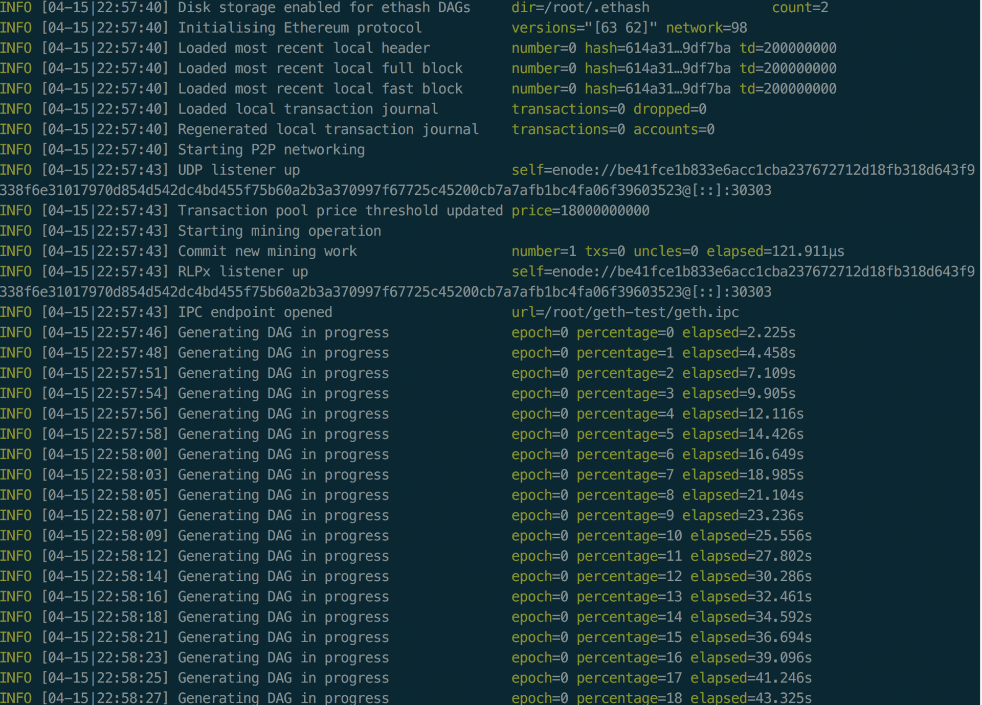 $ geth --datadir /root/geth-test/ --networkid 98 --mine --minerthreads=1 --etherbase=0xf8f7ff845596f0bab1e973859bfcaec6cd2a82ab