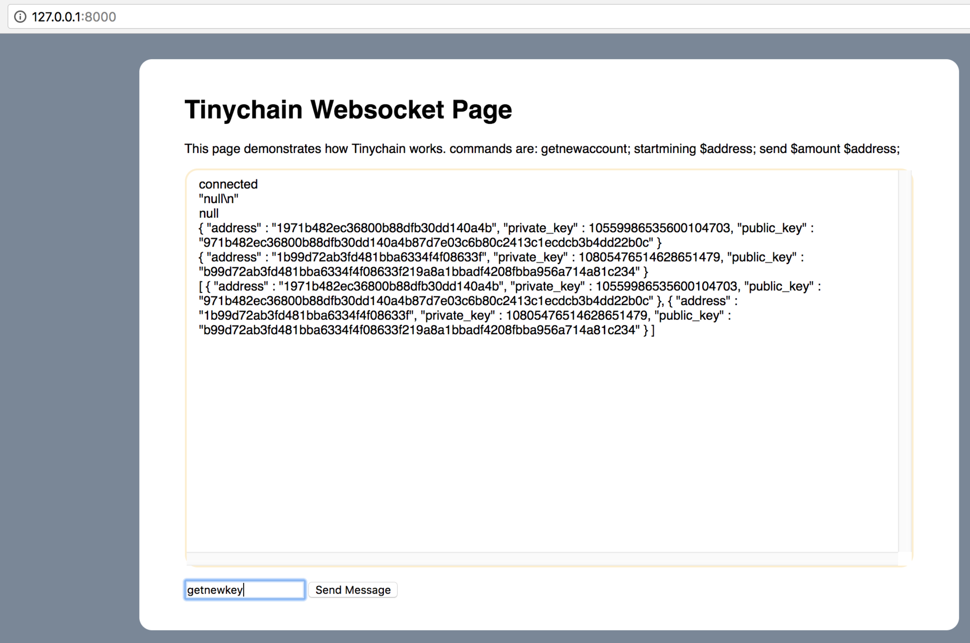 我们保持挖矿,接下来发送一笔交易。 我们先通过getnewkey命令获得一个新公私钥对以及对应的地址。