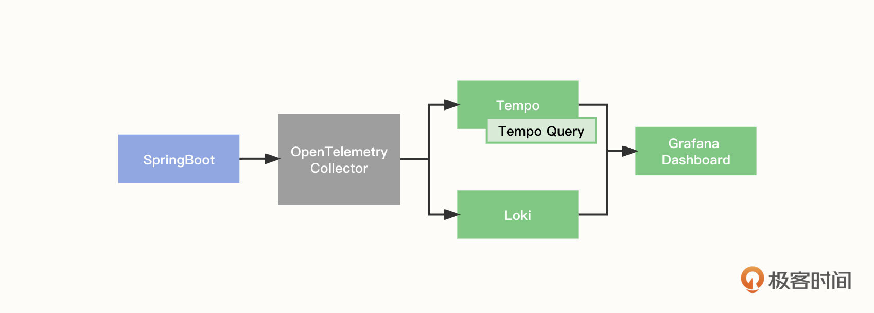 随着这两年可观测的流行,Grafana 也开始进军可观测行业。使用 Grafana 对接 OpenTelemetry 的架构如下图所示,这里面主要用到 Grafana Tempo 和 Loki 两个组件。