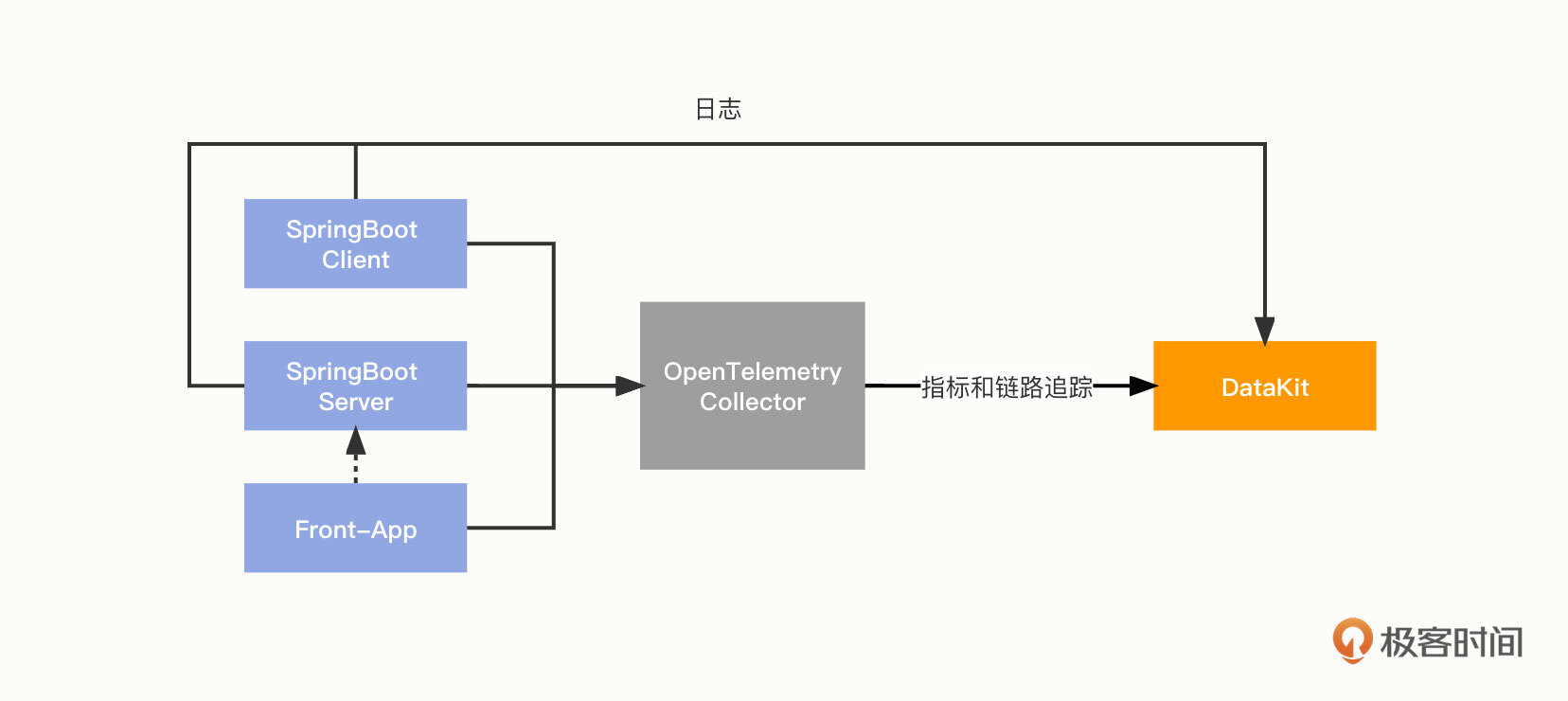 • 仍然是以一个 SpringBoot 应用为例,应用服务端和客户端将指标、链路追踪数据通过 Exporter 推送到 Collector;