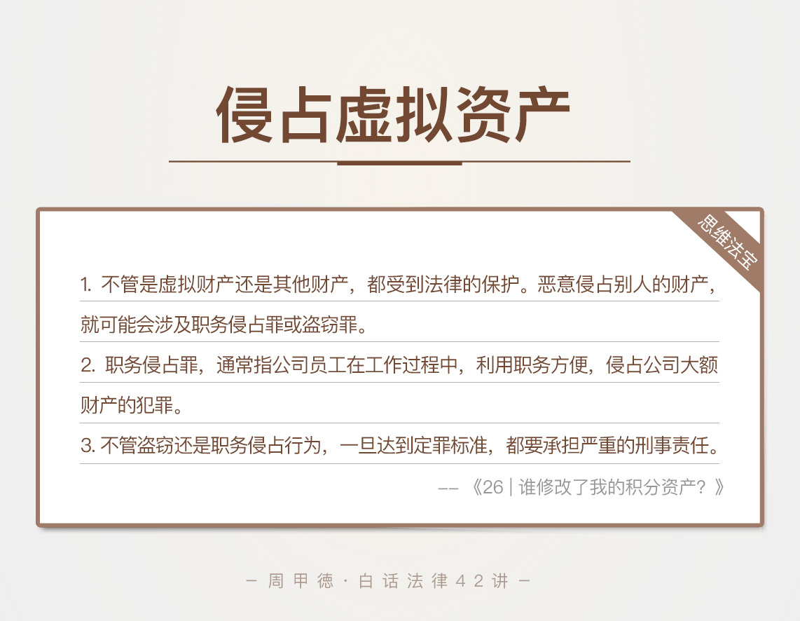 所以,不管是虚拟财产还是其他财产,都受到法律的保护。恶意侵占别人的财产,就可能会涉及职务侵占罪或盗窃罪。