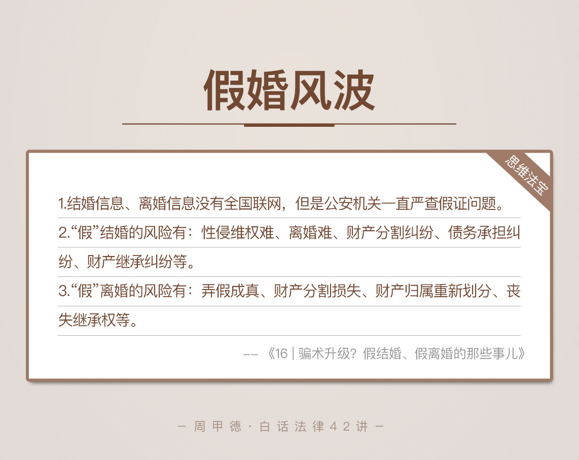 今天的内容我就讲到这里。从“假”意愿的结婚、离婚,到证件的真真假假,其实想传达的还是相同的法律思维:一要看法(证件),二要看合同(协议约定)。所有你发现的漏洞,基本都有人踩过雷、付出过代价。遵纪守法,看着容易,可是跟人心的贪婪相比,做起来很难。