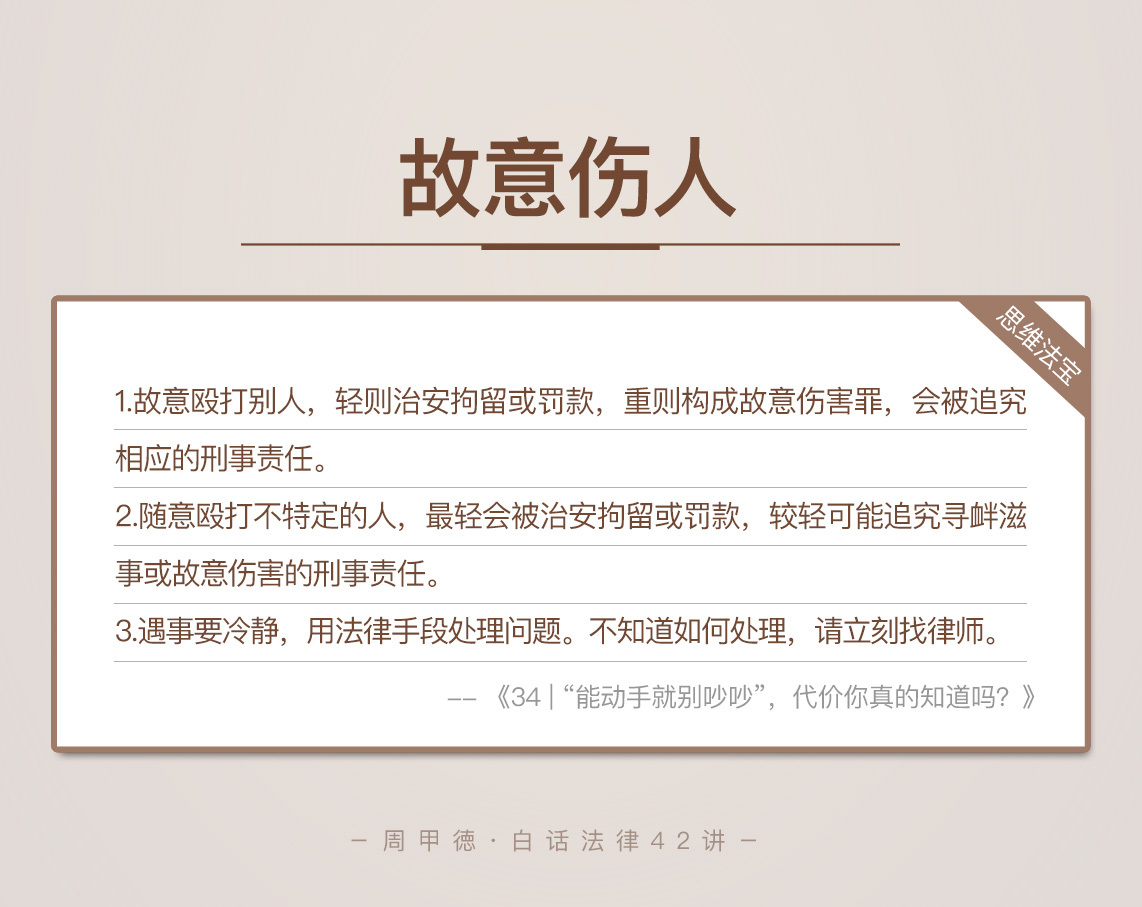 今天的内容主要就是这些。对于故意伤害,估计你并不陌生,你有什么经历或者疑惑吗?欢迎留言和我分享,也欢迎你把这篇文章分享给你的亲朋好友。能用法律解决的事儿,就别亲自动手了。