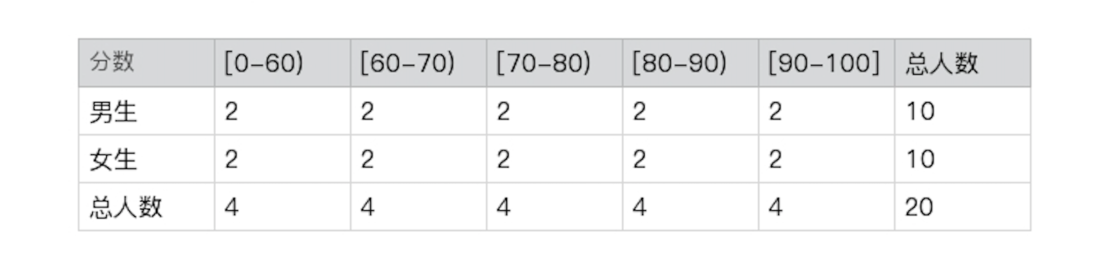 这张表中有两个随机变量,一个是学生的性别,一个是分数区间。我们很容易就可以得出,这个班中男生的概率是P(男生)=10⁄20=50%,90分及以上的学生的概率是P(90-100)=4⁄20=20%。那全班考了90分以上的男生的概率是多少呢?我们只要找到90分以上的男生人数,用这个人数除以全班总人数就行了,也就是P(男生, 90-100)=2⁄20=10%。