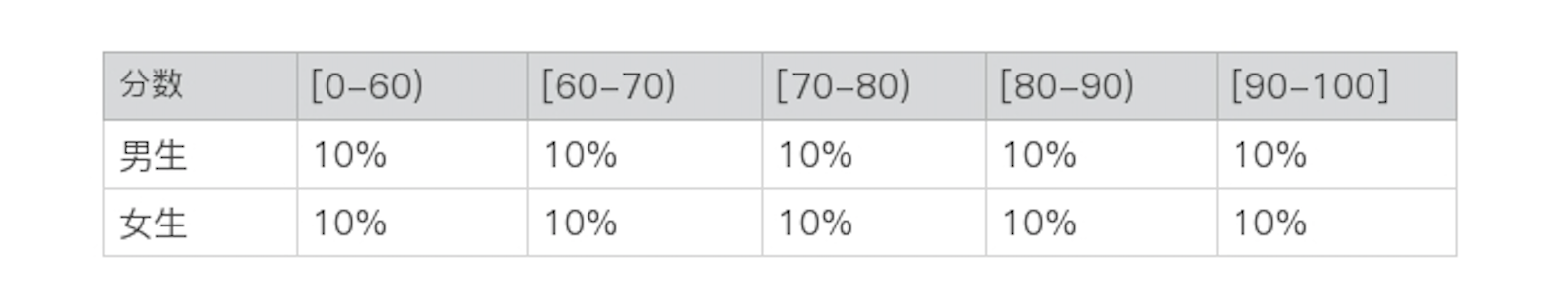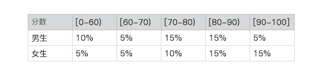 所以,p(90-100 | 男生) = p(90-100 | 女生) = p(90-100),也就是全班中考90分及以上的概率、男生中考90分及以上的概率、以及女生中考90分及以上的概率,这三者都是一样。以此类推到其他的分数区间,同样如此,那么,从这个数据上得出的结论是性别对考分的区间没有影响。反之,我们也可以看到p(男生 | 90-100) = p(男生 | 80-90) = p(男生 | 70-80) = … = p(男生) = 50%,也就是说考分区间对性别没有影响。这种情况下我们就说性别和分数这两个随机变量是相互独立的。