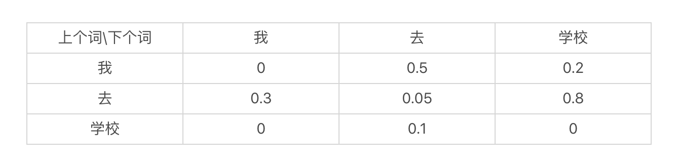 我们可以根据某个应用的需要,把上述状态转移表具体化。例如,对于语言模型中的二元文法模型,我这里列出了一个示意表。