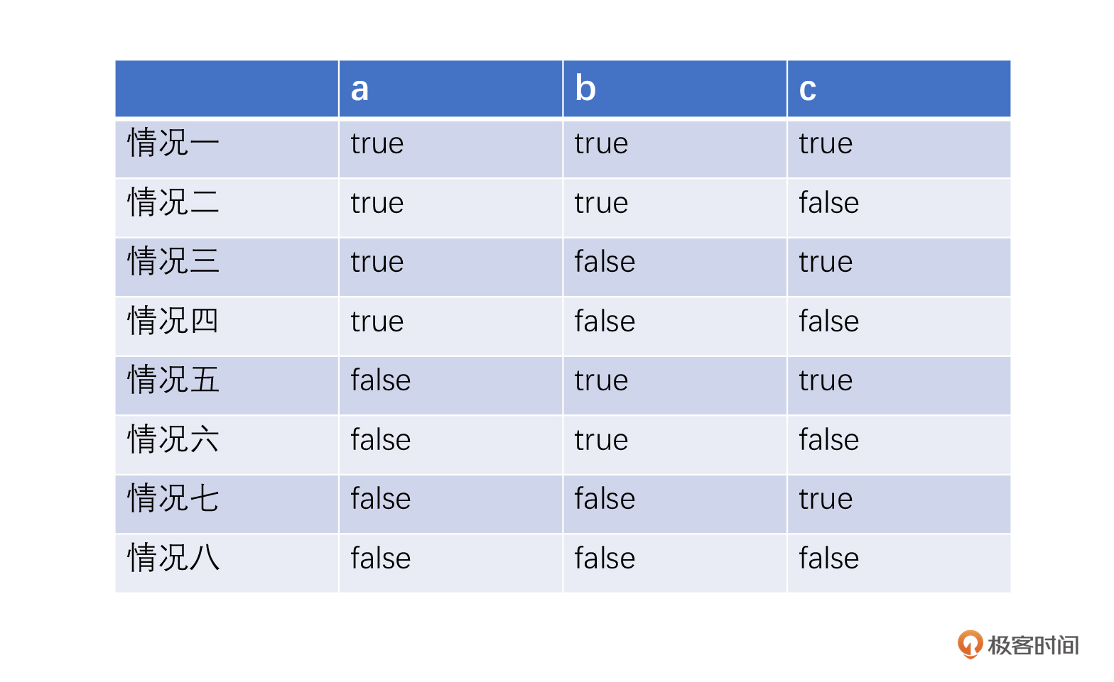 就是这么一个看上去很简单的情况,因为它牵扯到 a、b、c 三个子表达式,又要把每个子表达式的真假值都要测试到,所以,就需要有 8 种情况。