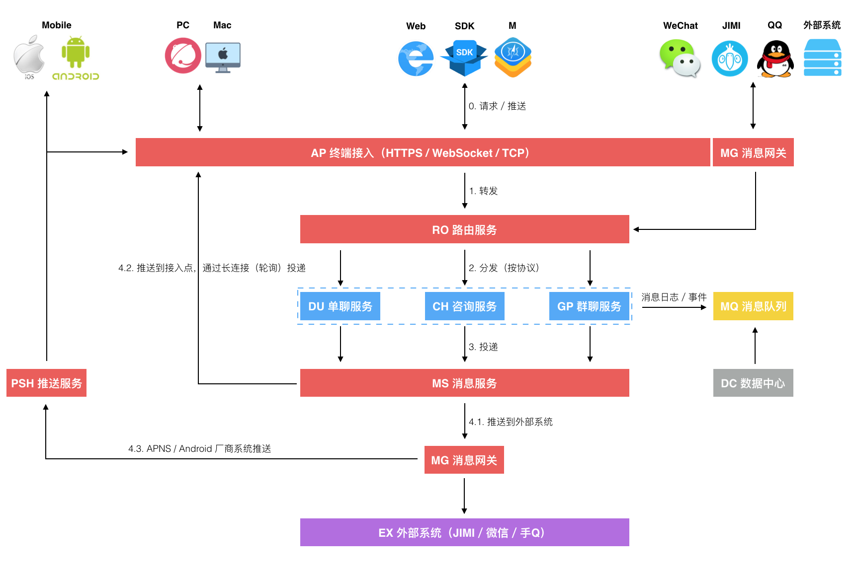 下图是咚咚消息投递的一个功能逻辑流程表达,看起来就像是 UML 的序列图,但并没有完全遵循 UML 的图例语法(主要是我习惯的画图工具不支持)。而且,我想更多人即使是程序员也并不一定会清楚地了解和记得住 UML 的各种图例语法,所以都用文字做了补充说明,也就没必要一定要遵循其语法了,重点还是在于要把逻辑表达清楚。