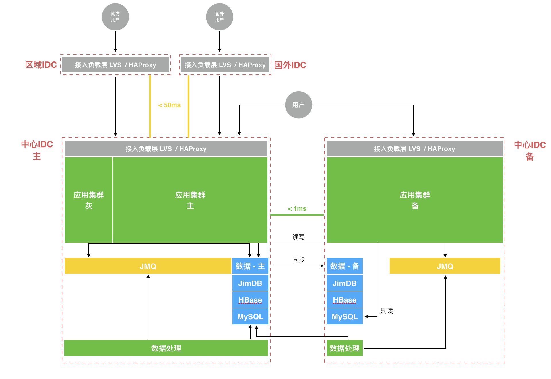 部署视图本身也可以从不同的视角来画,这取决于你想强调什么元素。上面这张示例图,强调的是应用部署的 IDC 及其之间的网络关系,和一些关键的网络通讯延时指标。因为这些内容可能影响系统的架构设计和开发实现方式。