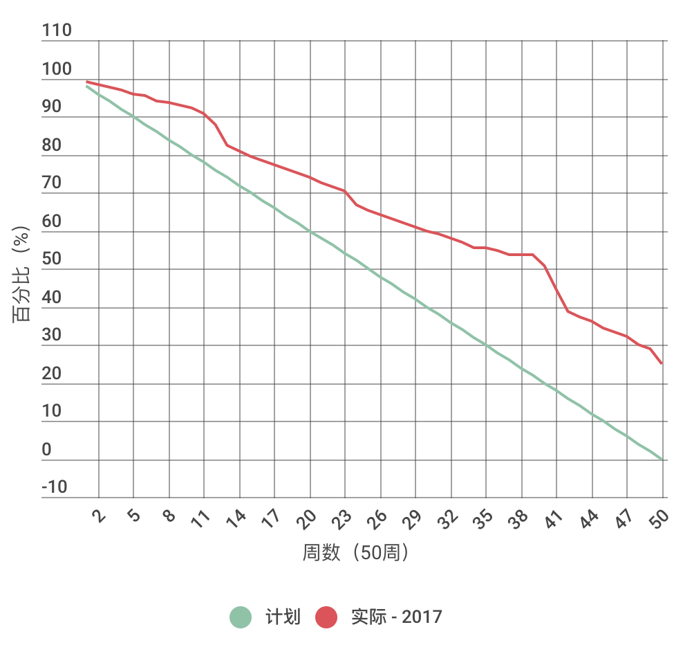 其实,一年值得放进这张表的就那么几件事,每件事又可以分解为具体的几个可量化的任务,再分解到一年 50 周,就可以很明显地看出理想计划和现实路径的曲线对比。如下,是我 2017 年的一张计划与实际执行的对比曲线图: