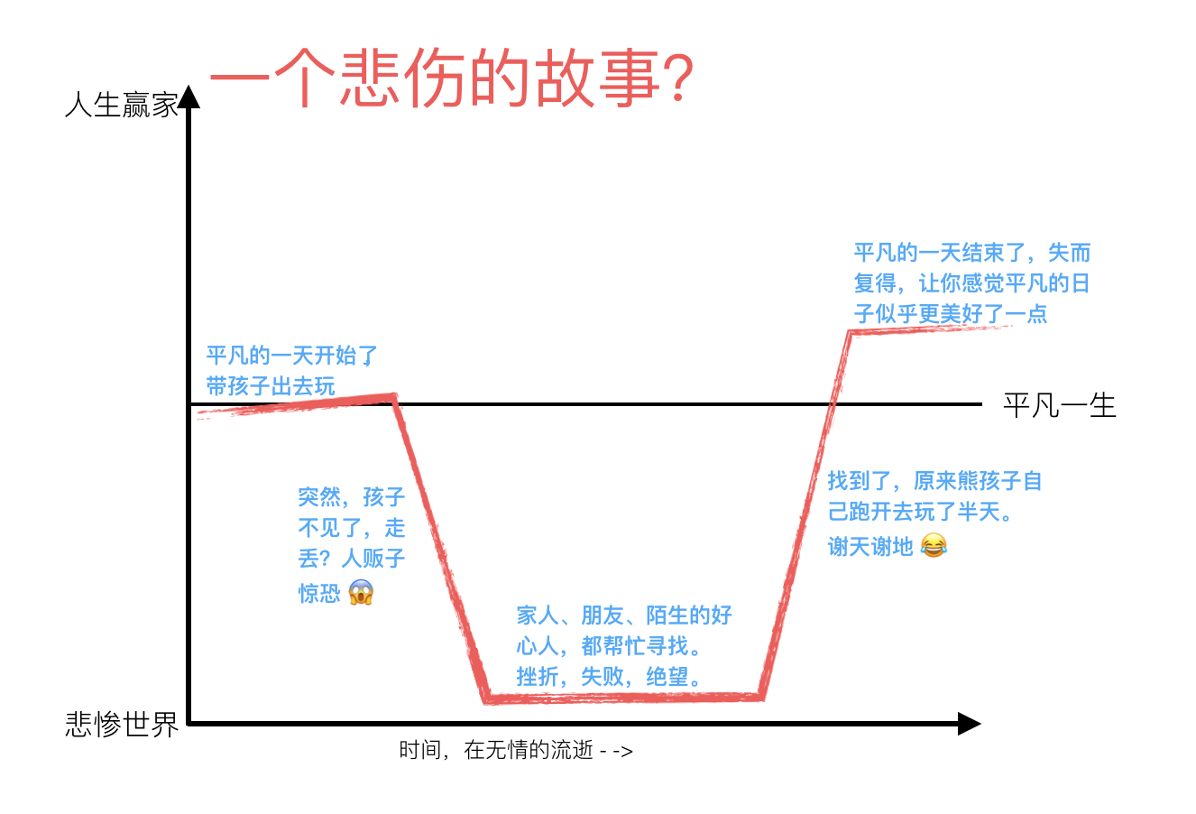 其中,纵坐标表示生活的幸福程度。越往上,代表幸福指数越高;越往下,代表幸福指数越低。中间的横线表示普通大众的平凡人生。