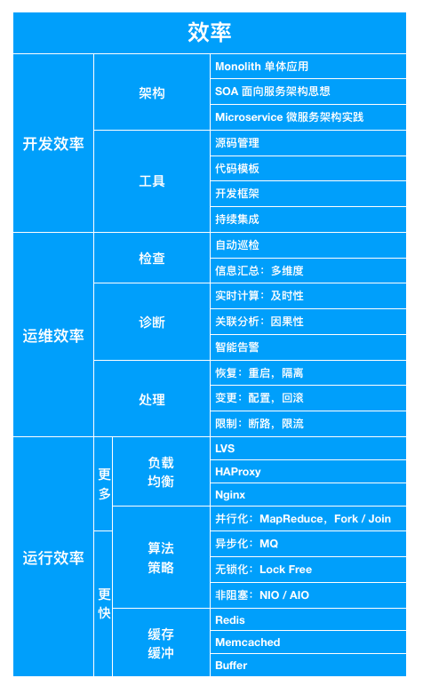 效率,从程序系统的角度看,同样也是从 “开发”“运维” 和 “运行” 三个方面来考虑。如下图所示: