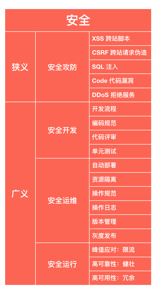 狭义的安全,就是传统信息安全领域的 “安全攻防” 范畴。比如,客户端的跨站脚本攻击(XSS)、服务端数据库的 SQL 注入、代码漏洞以及针对服务可用性的拒绝服务攻击(DDoS)等。这个方面的 “安全” 含义是信息技术行业独有的,但前面电站例子中指的 “安全” 更多是 “广义” 层面的。