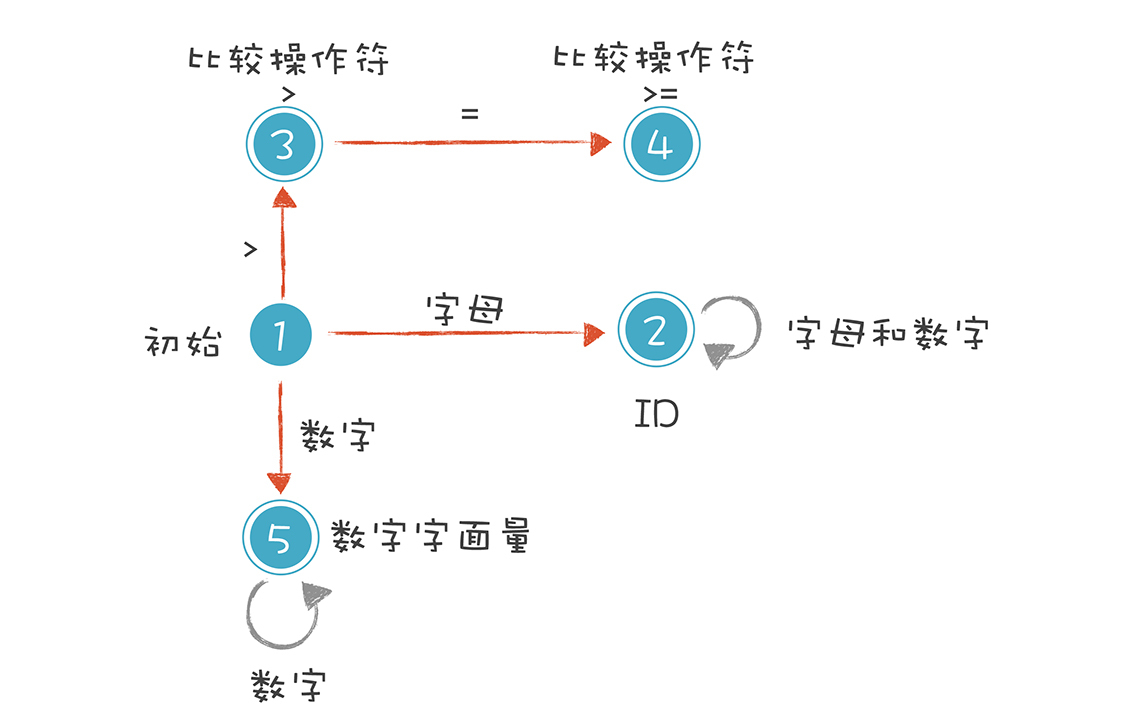 接下来,我们先来解析一下“age >= 45”这个关系表达式,这样你就能理解有限自动机的概念,知道它是做词法解析的核心机制了。