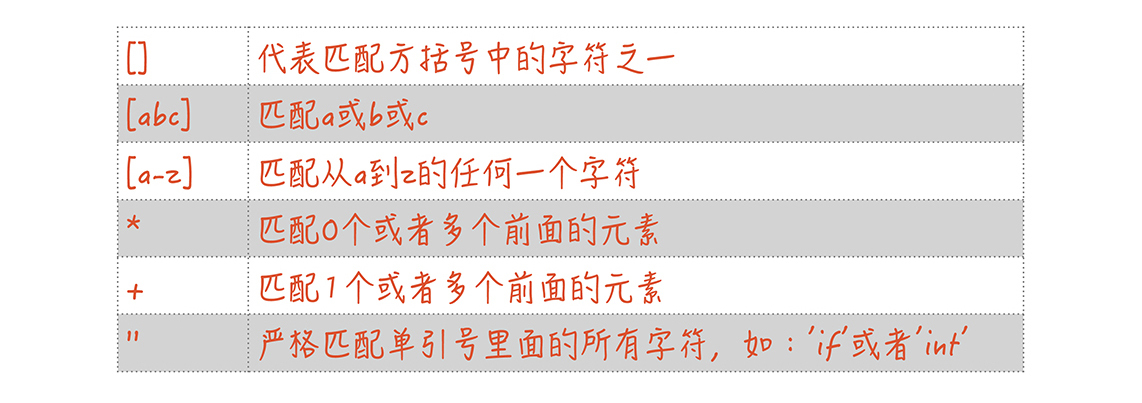 如果我们把这个语句涉及的词法规则用正则表达式写出来,是下面这个样子: