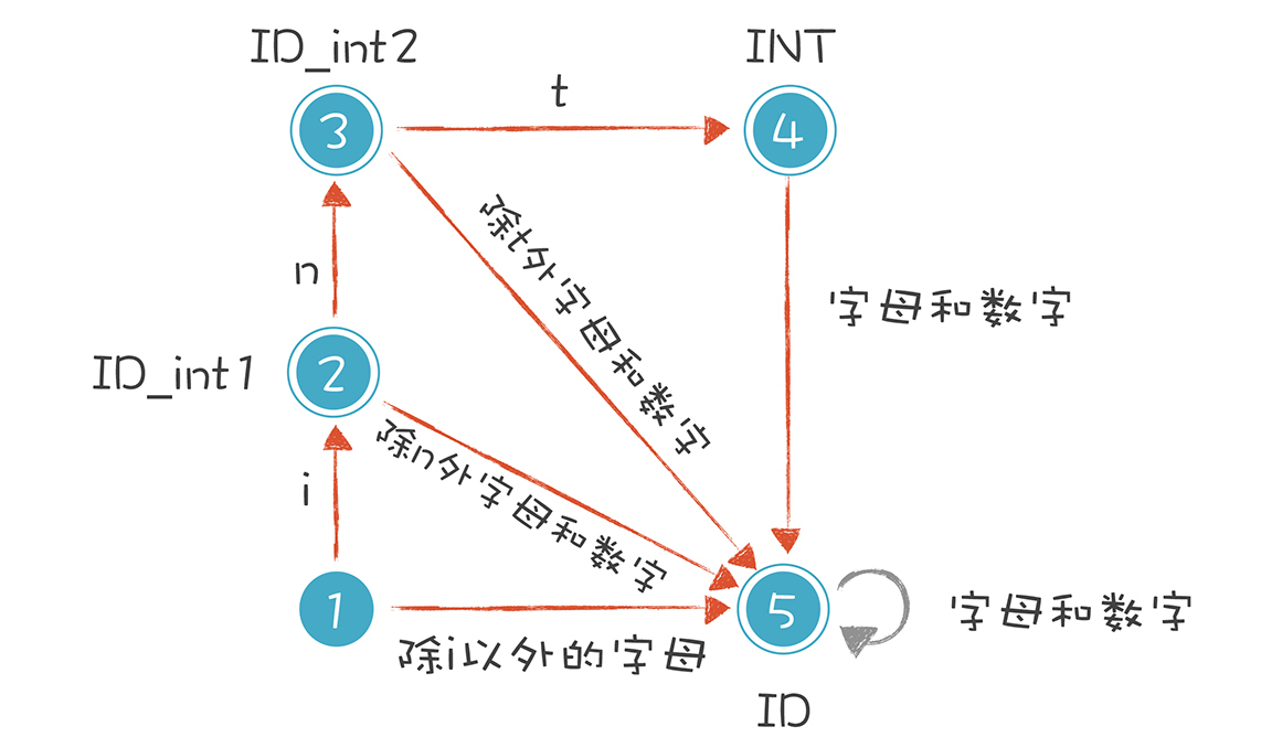 当第一个字符是i的时候,我们让它进入一个特殊的状态。接下来,如果它遇到n和t,就进入状态4。但这还没有结束,如果后续的字符还有其他的字母和数字,它又变成了普通的标识符。比如,我们可以声明一个intA(int和A是连着的)这样的变量,而不会跟int关键字冲突。
