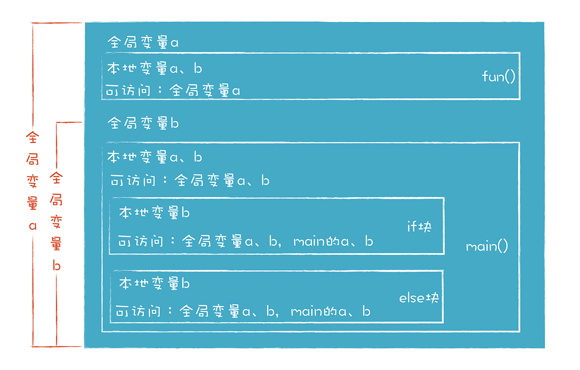 下面这张图直观地显示了示例代码中各个变量的作用域: