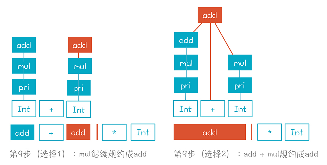 第一个选择是继续把mul规约成add,第二个选择是把“add+mul”规约成add。这两个选择都是错误的,因为它们最终无法形成正确的AST。