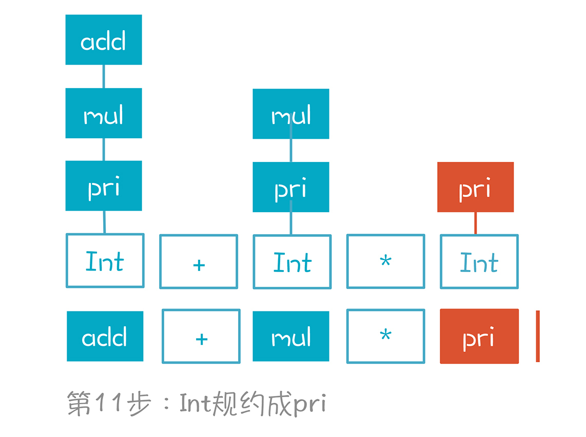第2步,根据语法规则,Int是从pri推导出来的(pri->Int),那么它的上级AST肯定是pri,所以,我们给它加了一个父节点pri,同时,也把栈里的Int替换成了pri。这个过程是语法推导的逆过程,叫做规约(Reduce)。