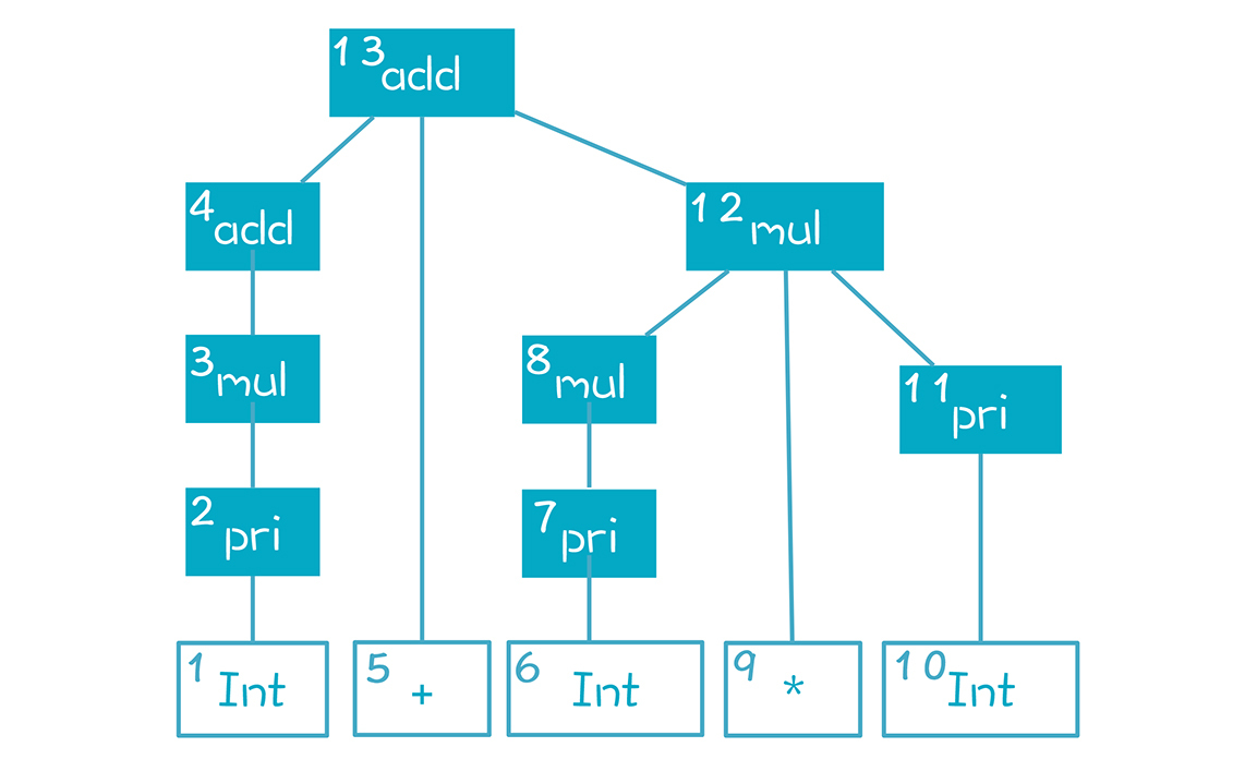 整个语法解析过程,实质是反向最右推导(Reverse RightMost Derivation)。什么意思呢?如果把AST节点根据创建顺序编号,就是下面这张图呈现的样子,根节点编号最大是13: