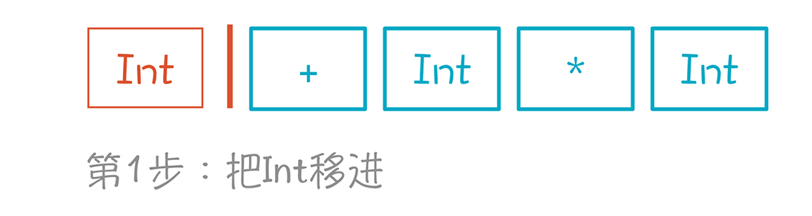 第1步,看到第一个Token,是Int,2。我们把它作为AST的第一个节点,同时把它放到一个栈里(就是图中红线左边的部分)。这个栈代表着正在处理的一些AST节点,把Token移到栈里的动作叫做移进(Shift)。