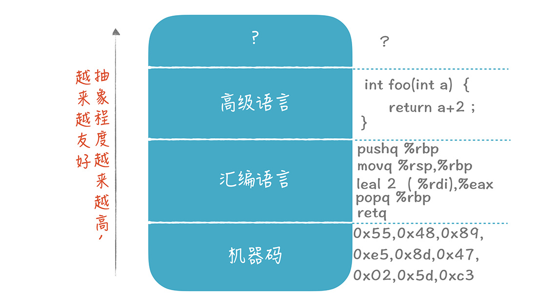 程序员最早是直接编写机器码,指令和寄存器都要直接用0101来表示。后来,冯·诺依曼的一个学生,发明了用助记符的方法(也就是汇编语言)简化机器码的编写。用汇编语言编程的时候,你仍然要使用指令和寄存器,但可以通过名称来引用,比如34讲中,用pushq %rbp这样的汇编指令来表示机器码0x55。这就增加了一个抽象层次,用名称代替了指令和寄存器的编码。