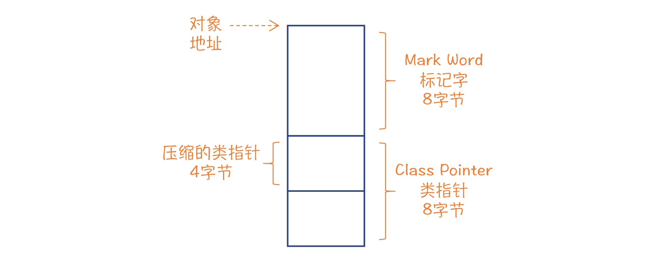 在64位平台下,每个Java对象头部都有8字节的标记字,里面有对象ID的哈希值、与内存收集有关的标记位、与锁有关的标记位;标记字后面是一个指向类定义的指针,在64位平台下也是8位,不过如果堆不是很大,我们可以采用压缩指针,只占4个字节;在这后面才是x和y字段。因此,x和y的偏移量分别是12和16。