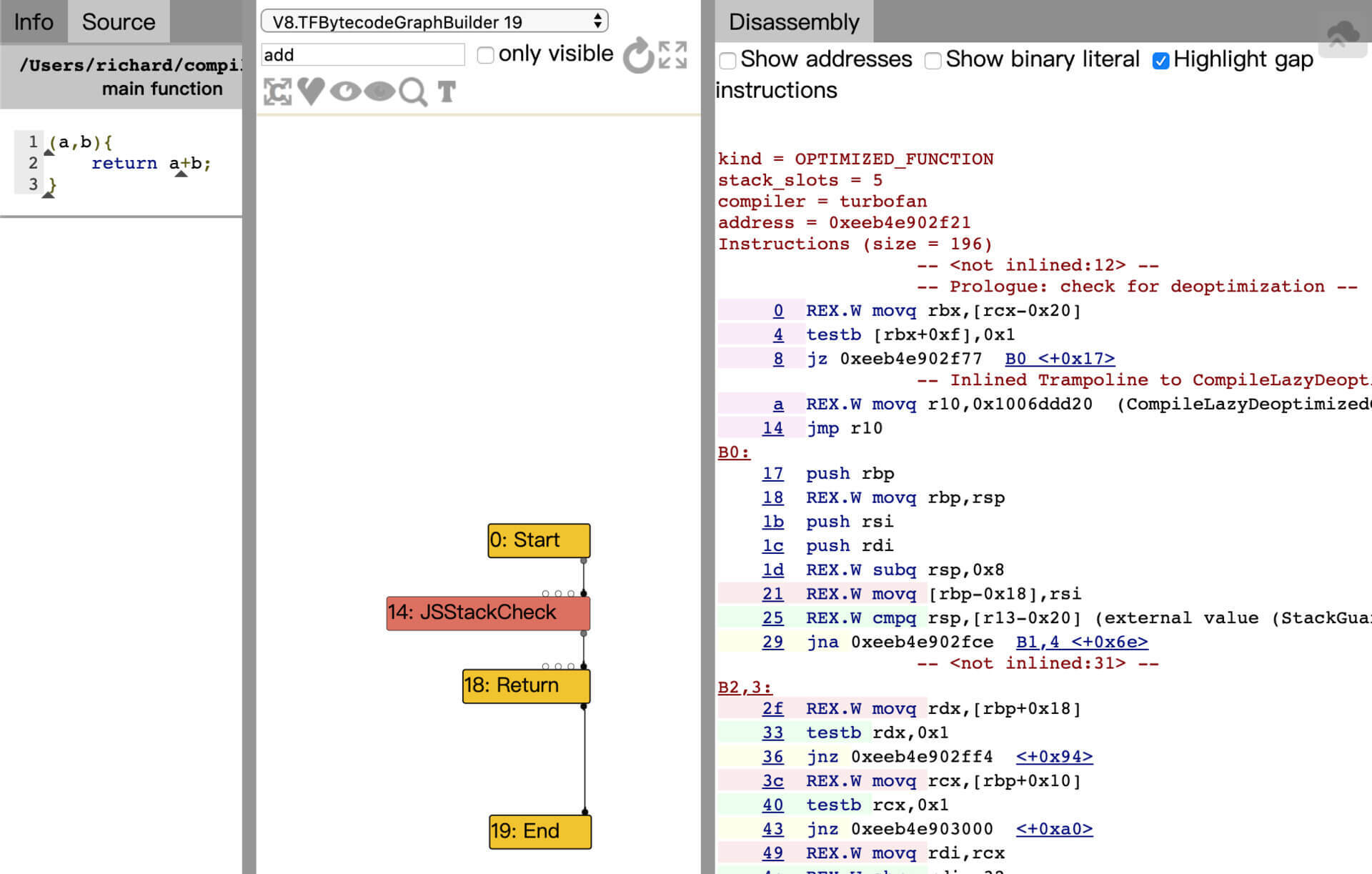 但是,如果不在解释器里执行,直接要求TurboFan做编译,会生成什么样的汇编代码呢?