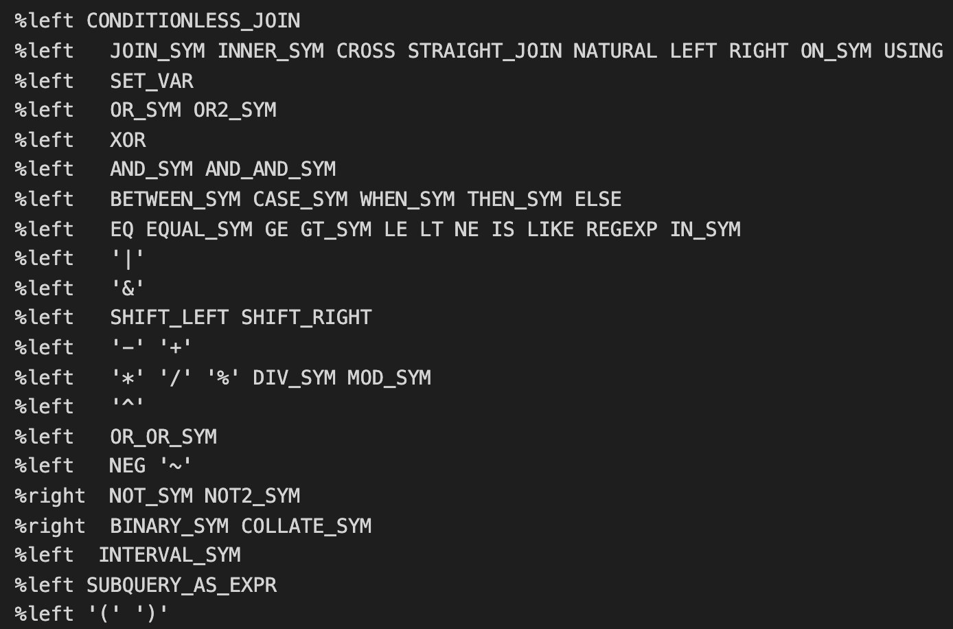 原来,bison里面有专门的规则,可以规定运算符的优先级和结合性。在sql_yacc.yy中,你会看到如下所示的规则片段:
