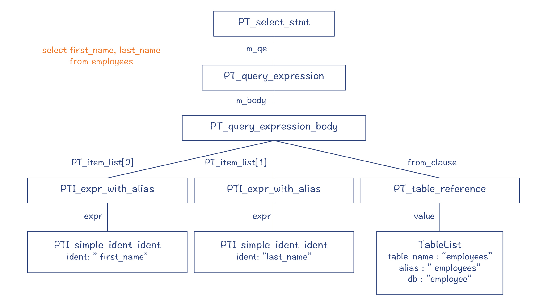 最后,对于“select first_name, last_name from employees”这样一个简单的SQL语句,它所形成的解析树如下: