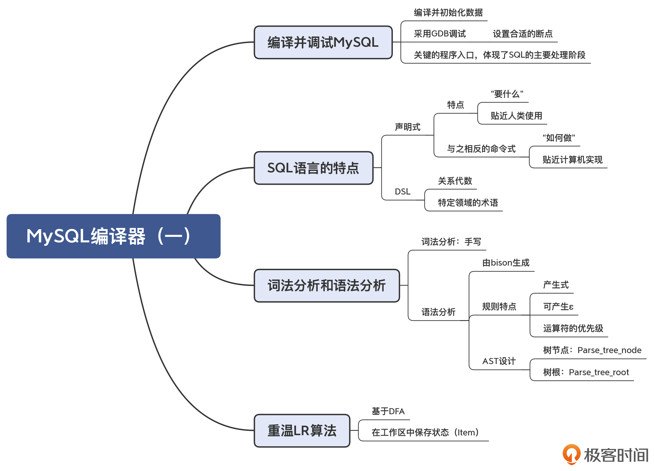 好了,现在我们分析了SQL的特点,从而也让你了解了DSL的一些共性特点。那么接下来,顺着MySQL运行的脉络,我们先来了解一下MySQL是如何做词法分析和语法分析的。