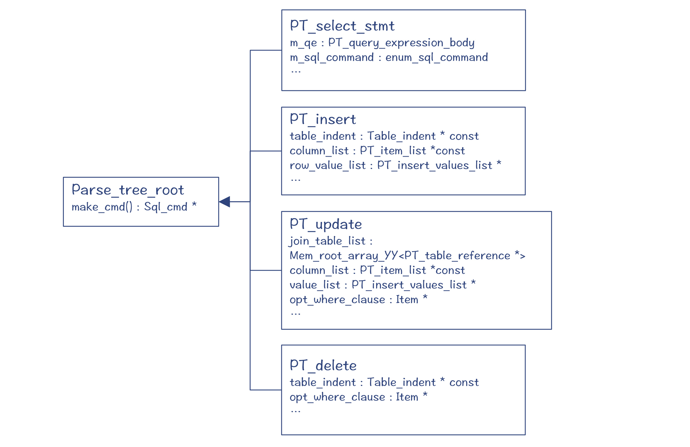 由于SQL是一个个单独的语句,所以select、insert、update等语句,它们都各自有不同的根节点,都是Parse_tree_root的子类。