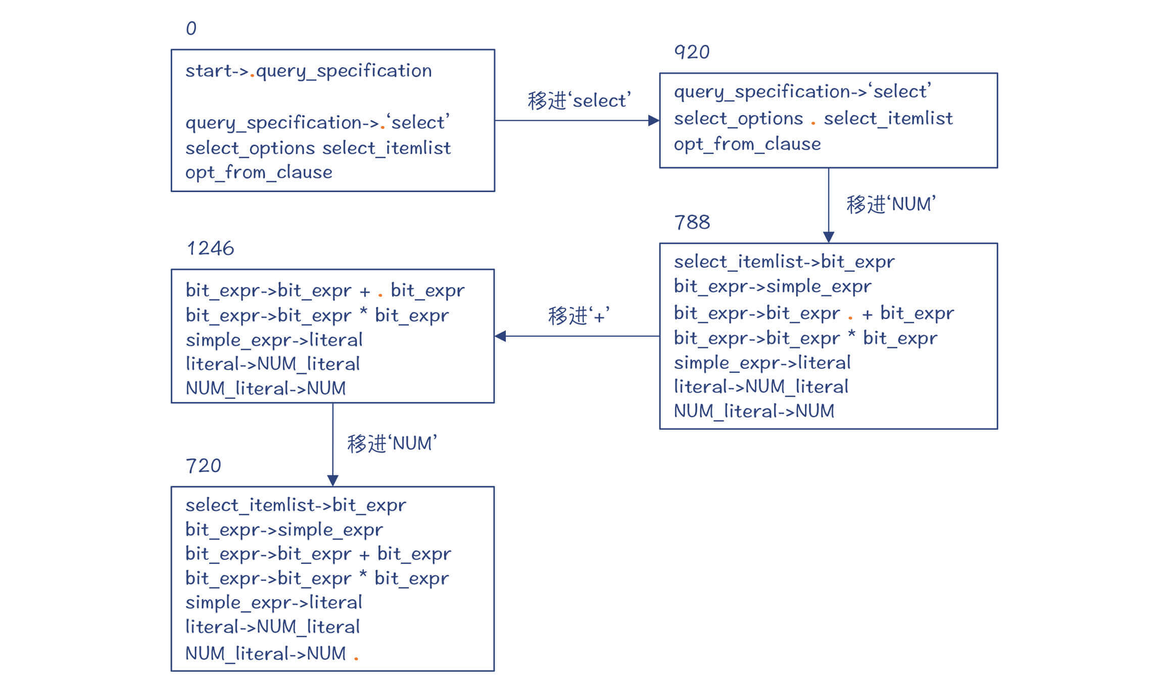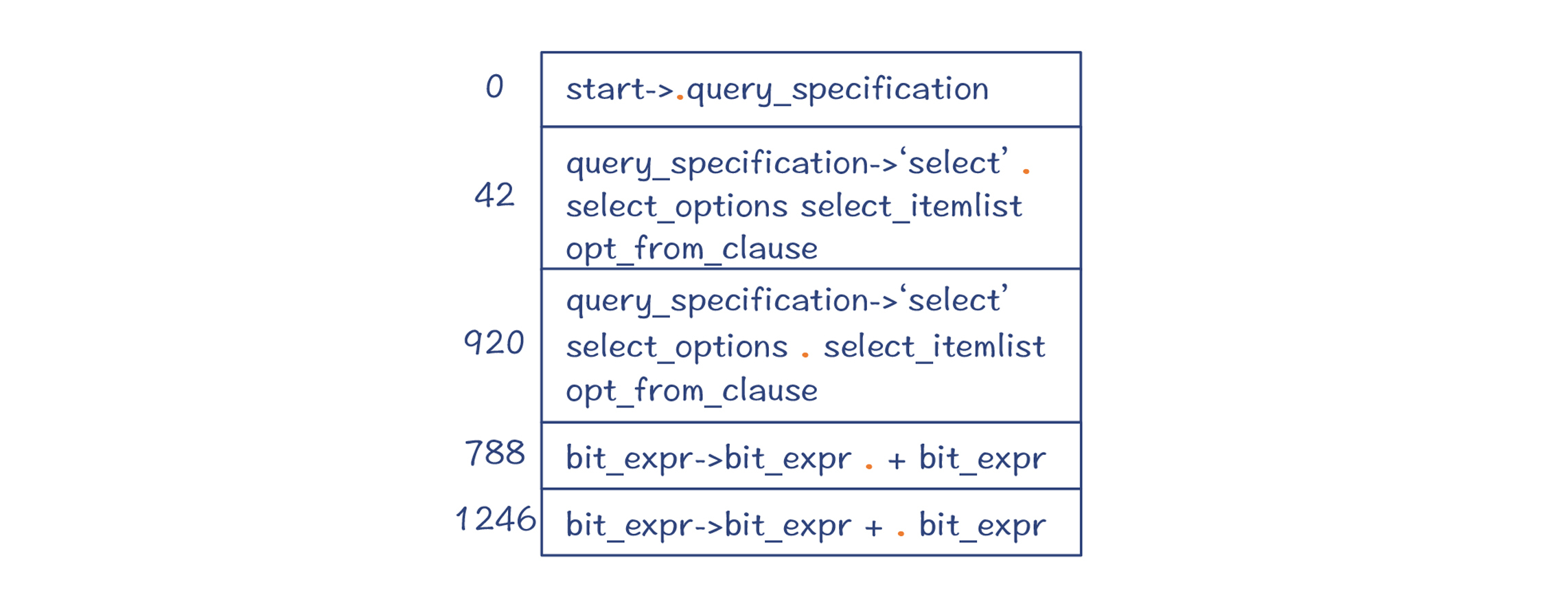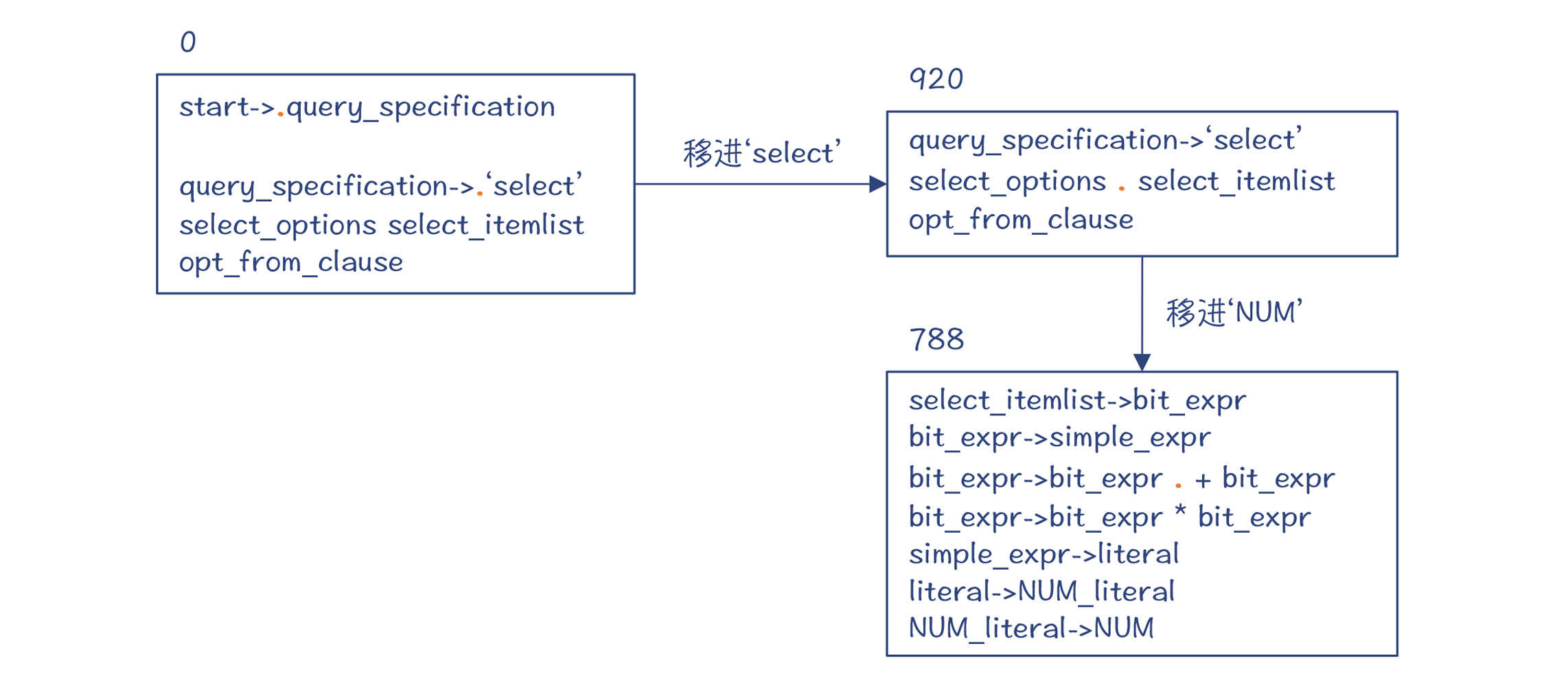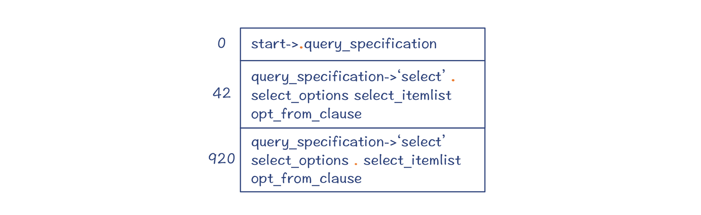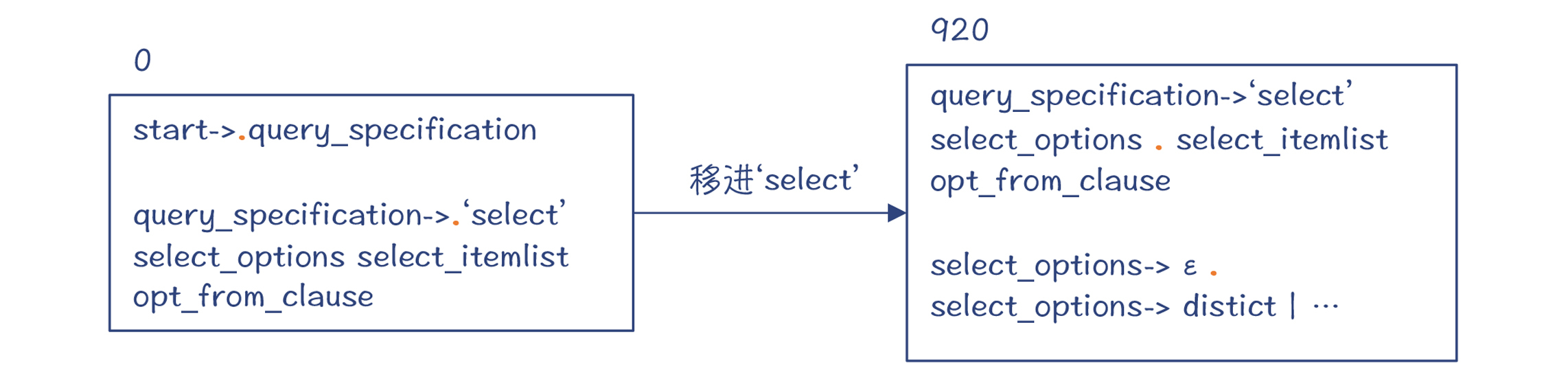也就是,编译器依据“select_options->ε”做了一次规约,并进入了新的状态920。注意,状态42和920从DFA的角度来看,它们是同一个大状态。而DFA中包含了多个小状态,分别代表了不同的规约情况。