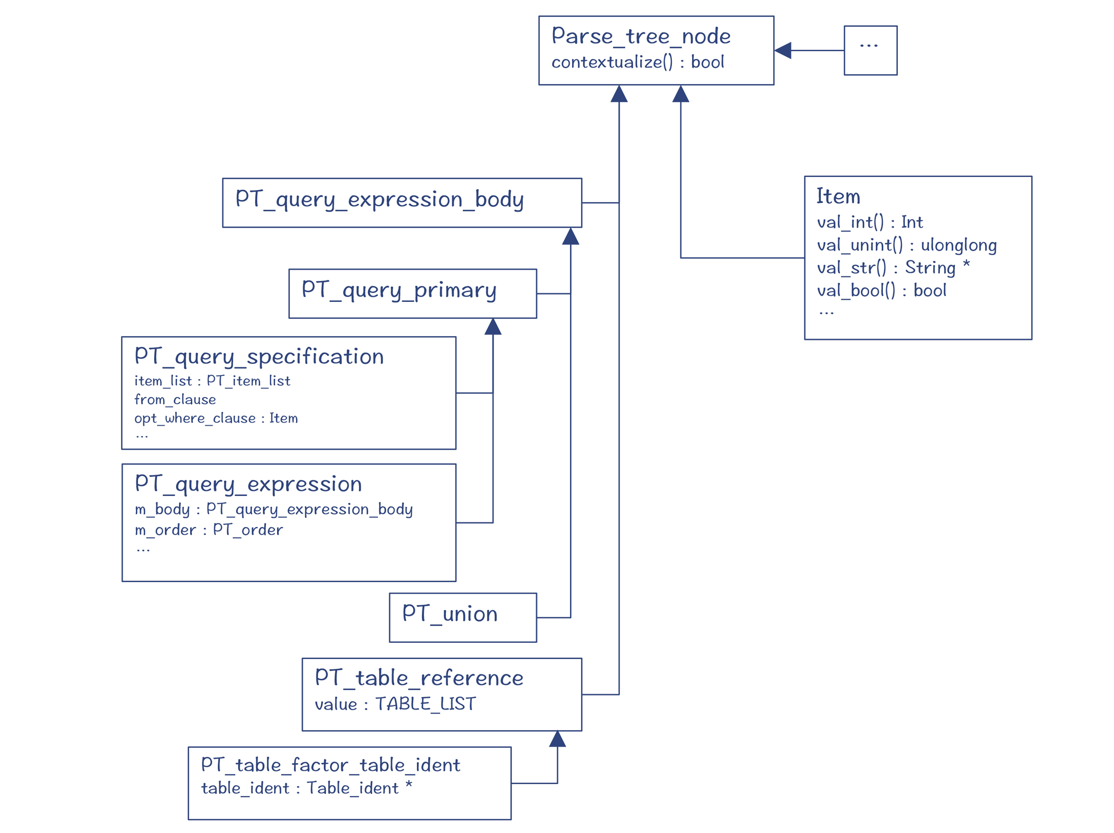 图4中的PT_query_expression等类,就是解析树的节点,它们都是Parse_tree_node的子类(PT是Parse Tree的缩写)。这些类主要定义在sql/parse_tree_nodes.h和parse_tree_items.h文件中。