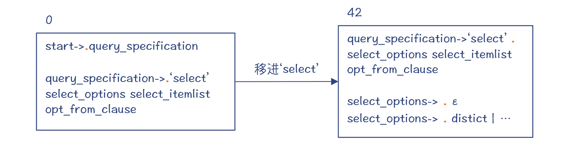 为了给你一个直观的印象,这里我画了DFA的局部示意图(做了一定的简化),如下所示。你可以看到,在状态42,点符号位于“select”关键字之后、select_options之前。select_options代表了“distinct”这样的一些关键字,但也有可能为空。