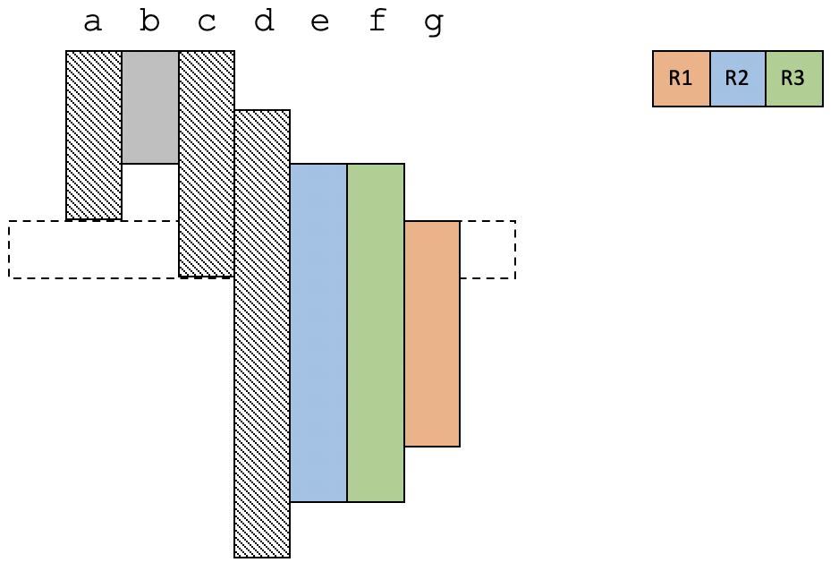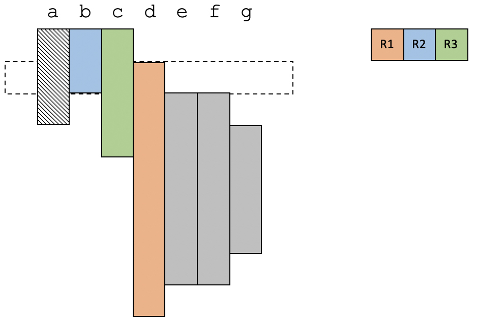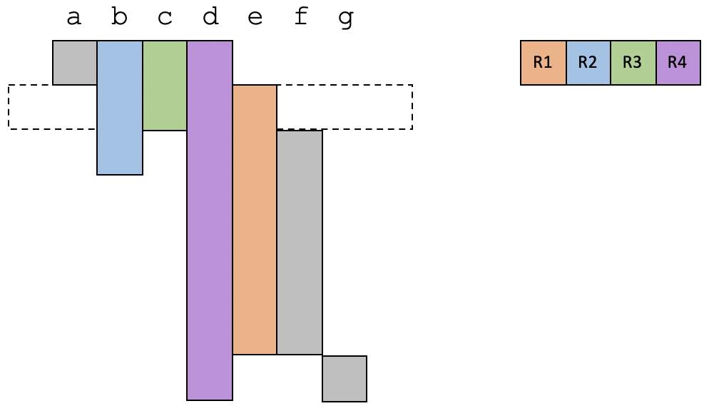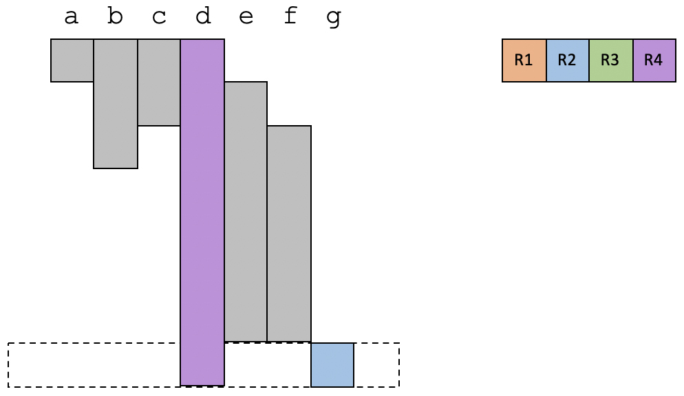 假设我们的程序里有从a到g共7个变量。通过数据流分析中的变量活跃性分析,你其实可以知道每个变量的生存期。现在,我们已知有4个物理寄存器可用,那么我们来看一下要怎么分配这几个物理寄存器。