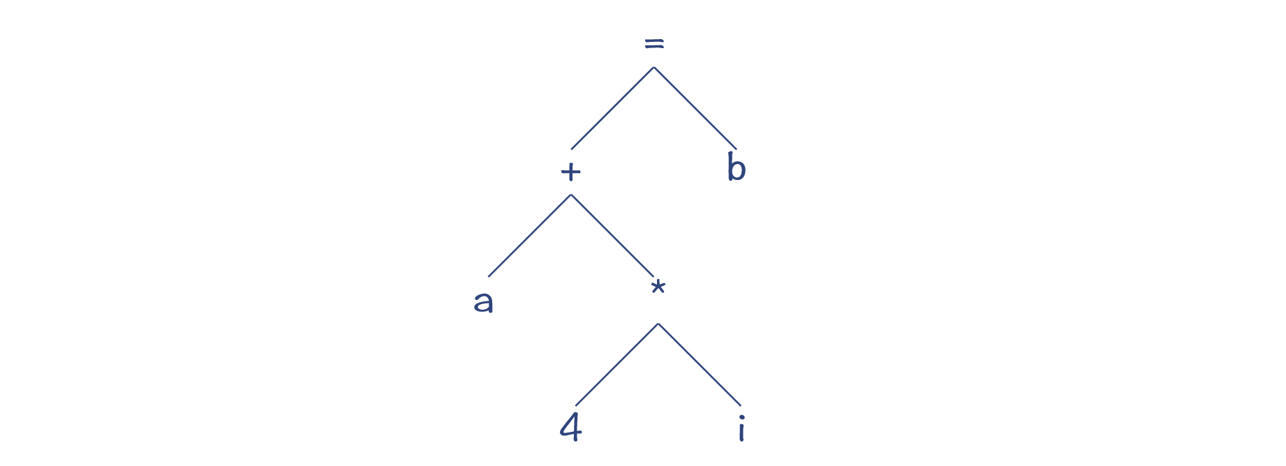 我先给你举个例子。针对表达式“a[i]=b”,它是对数组a的第i个元素赋值。假设a是一个整数数组,那么地址的偏移量就是a+4*i,所以,这个赋值表达式用C语言可以写成“*(a+4*i)=b”,把它表达成AST的话,就是下图所示的样子。其中,赋值表达式的左子树的计算结果,是一个内存地址。