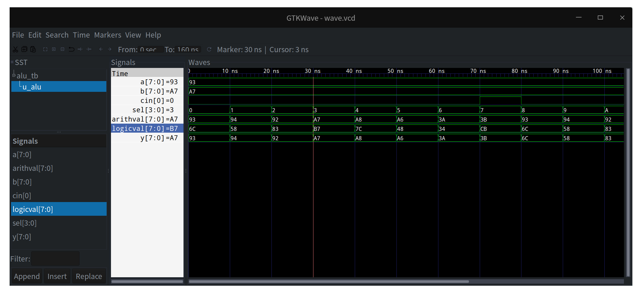 LXT2 info: dumpfile wave.vcd opened for output.- 10: a=93, b=a7, cin=0, sel=0, y=93 //指令0:y = a;- 20: a=93, b=a7, cin=0, sel=1, y=94 //指令1:y = a + 1;- 30: a=93, b=a7, cin=0, sel=2, y=92 //指令2:y = a - 1;- 40: a=93, b=a7, cin=0, sel=3, y=a7 //指令3:y = b;- 50: a=93, b=a7, cin=0, sel=4, y=a8 //指令4:y = b + 1;- 60: a=93, b=a7, cin=0, sel=5, y=a6 //指令5:y = b - 1;- 70: a=93, b=a7, cin=0, sel=6, y=3a //指令6:y = a + b;- 80: a=93, b=a7, cin=1, sel=7, y=3b //指令7:y = a + b + cin;- 90: a=93, b=a7, cin=0, sel=8, y=6c //指令8:y = ~a;- 100: a=93, b=a7, cin=0, sel=9, y=58 //指令9:y = ~b;- 110: a=93, b=a7, cin=0, sel=a, y=83 //指令10:y = a & b;- 120: a=93, b=a7, cin=0, sel=b, y=b7 //指令11:y = a | b;- 130: a=93, b=a7, cin=0, sel=c, y=7c //指令12:y = ~(a & b);- 140: a=93, b=a7, cin=0, sel=d, y=48 //指令13:y = ~(a | b);- 150: a=93, b=a7, cin=0, sel=e, y=34 //指令14:y = a ^ b;- 160: a=93, b=a7, cin=0, sel=f, y=cb //指令15:y = ~(a ^ b);